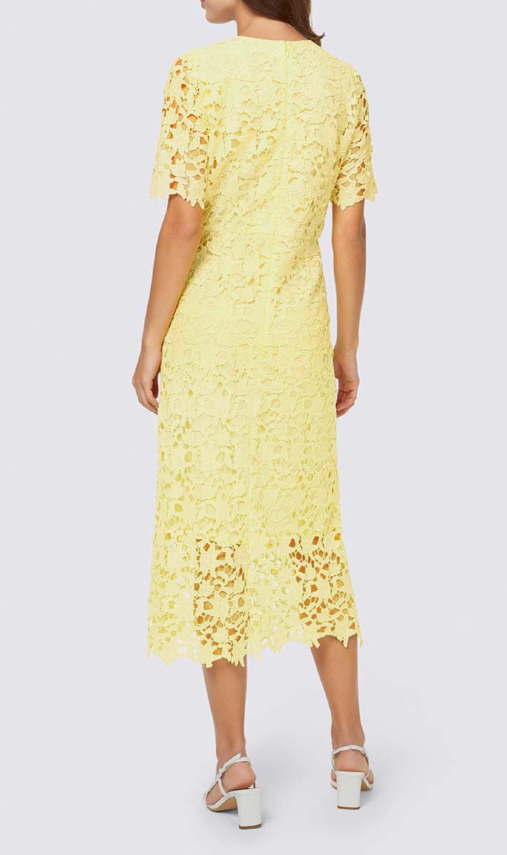 Das Ashley Brooke Spitzenkleid in Zitronengelb besticht durch seine hochwertige Stickerei-Spitze und eine feminine, schlanke Silhouette in Midi-Länge. Die aufwendigen Teilungsnähte und das spitze Dekolleté setzen elegante Akzente, während die bogenförmigen Schmucksäume und die komfortablen ½-Ärmel für einen stilvollen Look sorgen. Ein nahtfeiner, rückwärtiger Reißverschluss und das blickdichte Baumwollfutter gewährleisten angenehmen Tragekomfort. Mit einer Länge von ca. 120 cm ist dieses Kleid ein perfektes Statement für besondere Anlässe. Ohne Gürtel!