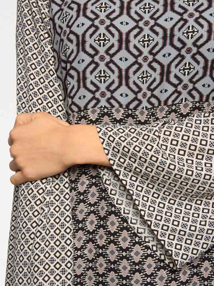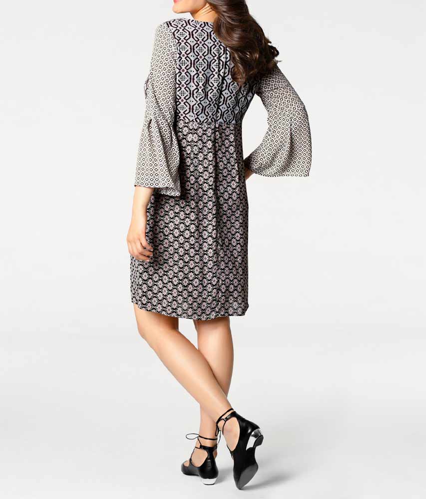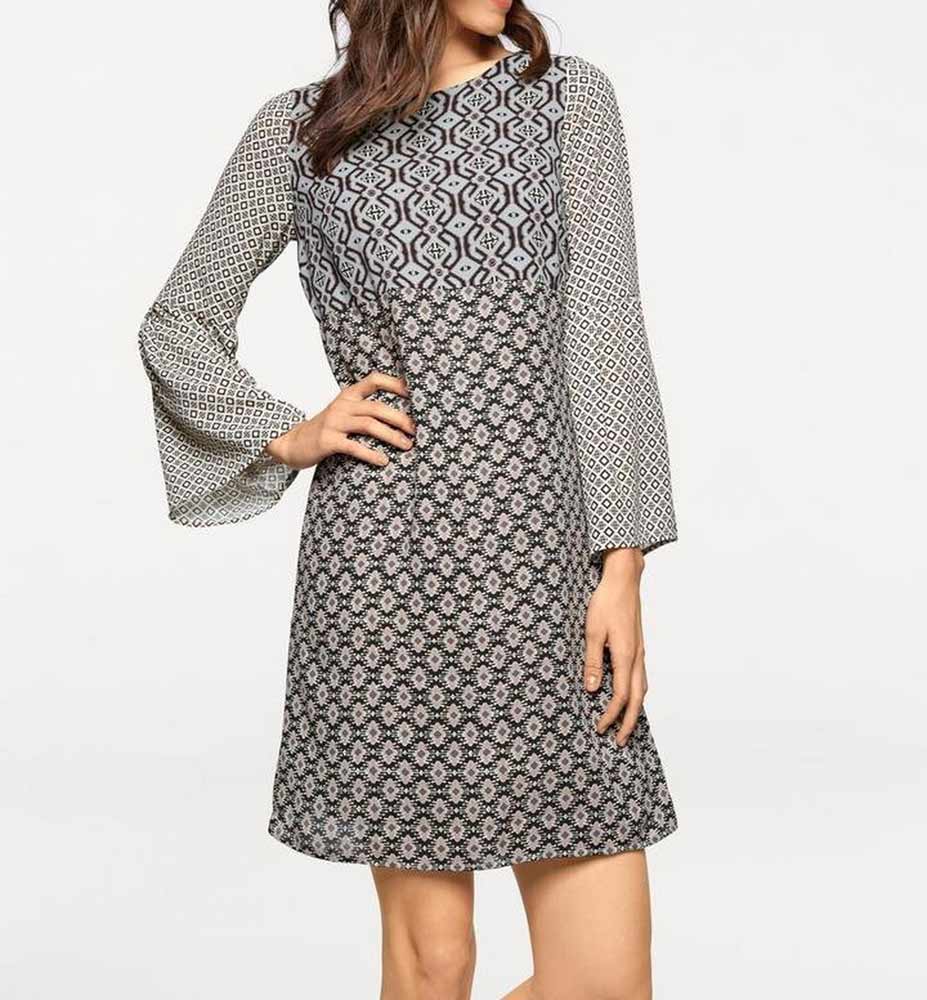 Das Linea Tesini Kleid besticht durch einen markanten Muster-Mix und eine ausdrucksstarke Patch-Optik in trendiger Farbkombination. Gefertigt aus hochwertigem, fein fließendem Crêpe-Material, bietet es eine figurumspielende Silhouette mit Unterbrustnaht, rundem Ausschnitt und modisch ausgestellten Trompetenärmeln. Mit einer Länge von ca. 98 cm und einem nahtfeinen, rückwärtigen Reißverschluss ist es sowohl alltagstauglich als auch bürotauglich. Das edle Material aus 100 % Polyester mit Futter aus 100 % Polyamid sorgt für angenehmen Tragekomfort und zeitlose Eleganz.