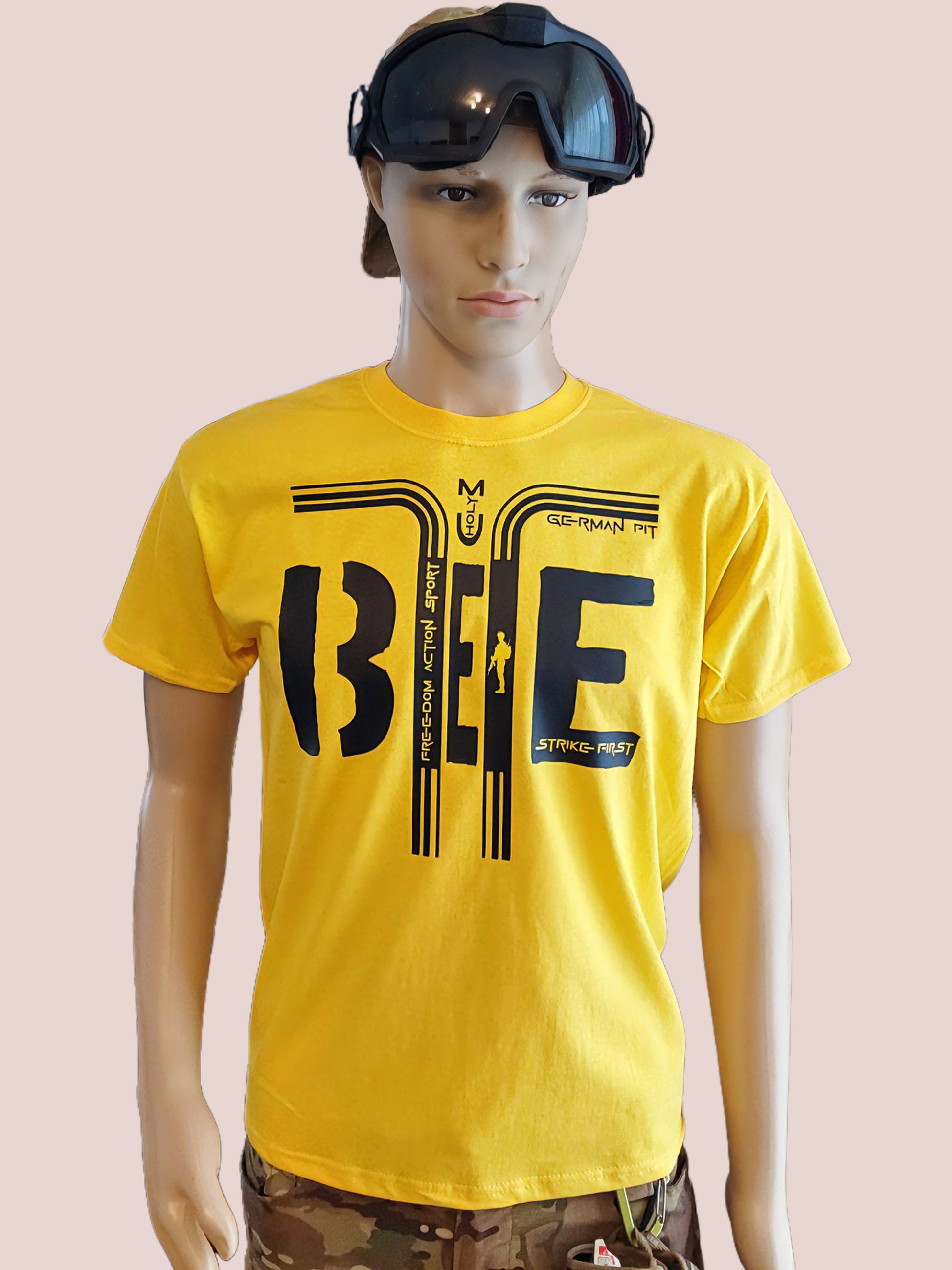 "Bee Strike First ist der Mittelpunkt des Spielfeldes. Mit der perfekten Kombination aus Gelb und Schwarz bist du der Anführer im Gefecht und bestreitest deinen Sieg sofort. Hol dir jetzt das ultimative Shirt für alle, die keine Kompromisse eingehen und immer als Sieger hervorgehen wollen."